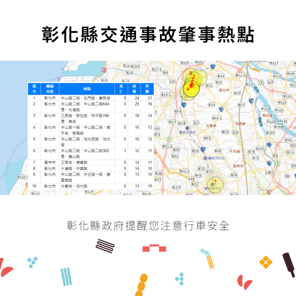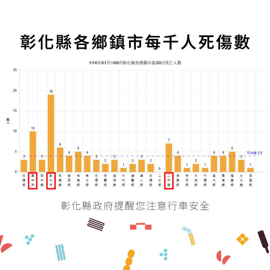 1-6月份30日鄉鎮市每千人死傷人數於「彰化市、員林市、二林鎮」為多,肇事熱點以「彰化市」為多,合先敘明。