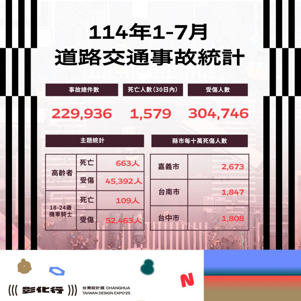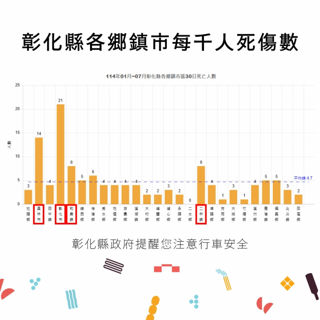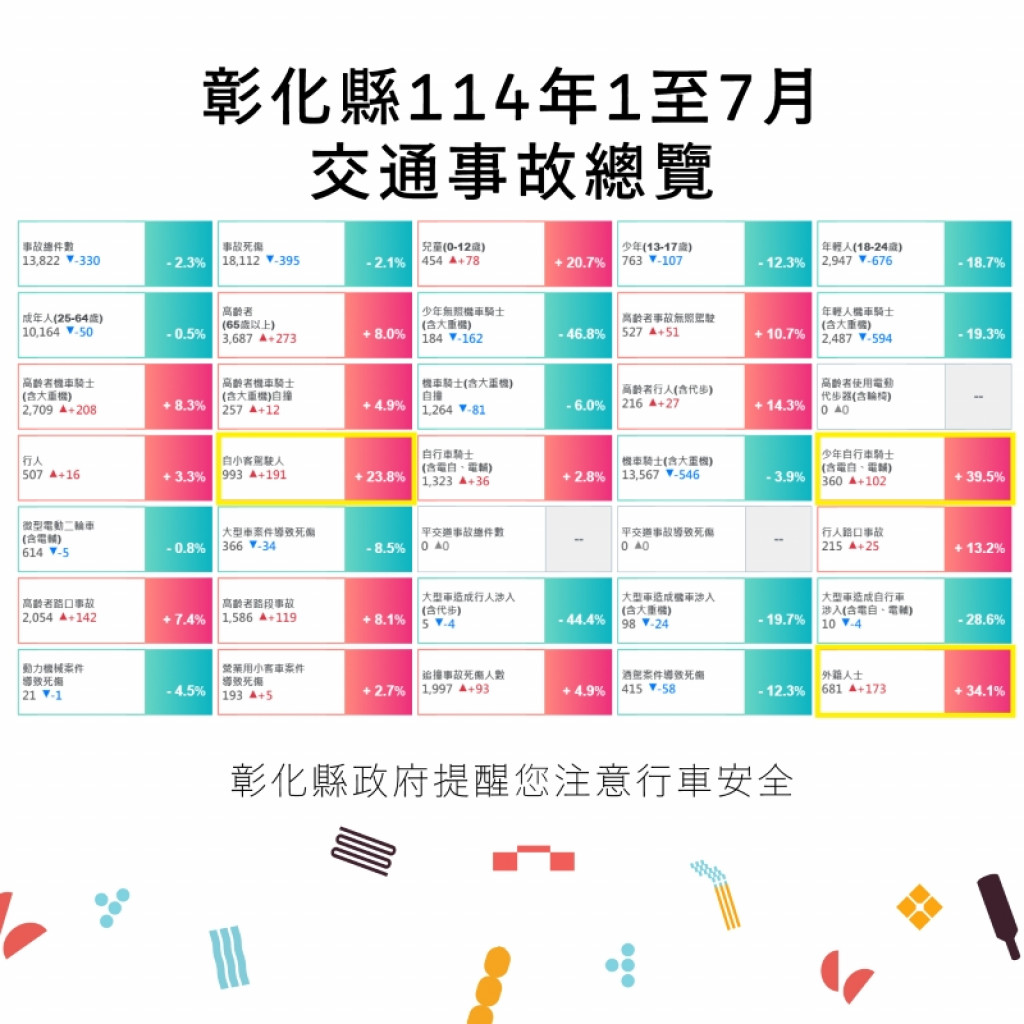 根據交通部道安資訊查詢網統計快覽數據跟112年同期比較分析,以少年自行車騎士(含電自、電輔) 事故增加39.5%最高,外籍人士事故增加34.1%次之,自小客車駕駛人增加23.8%再次之。1-7月份30日鄉鎮市每千人死傷人數於「彰化市、員林市、二林鎮、和美鎮」為多,肇事熱點以「彰化市」為多。