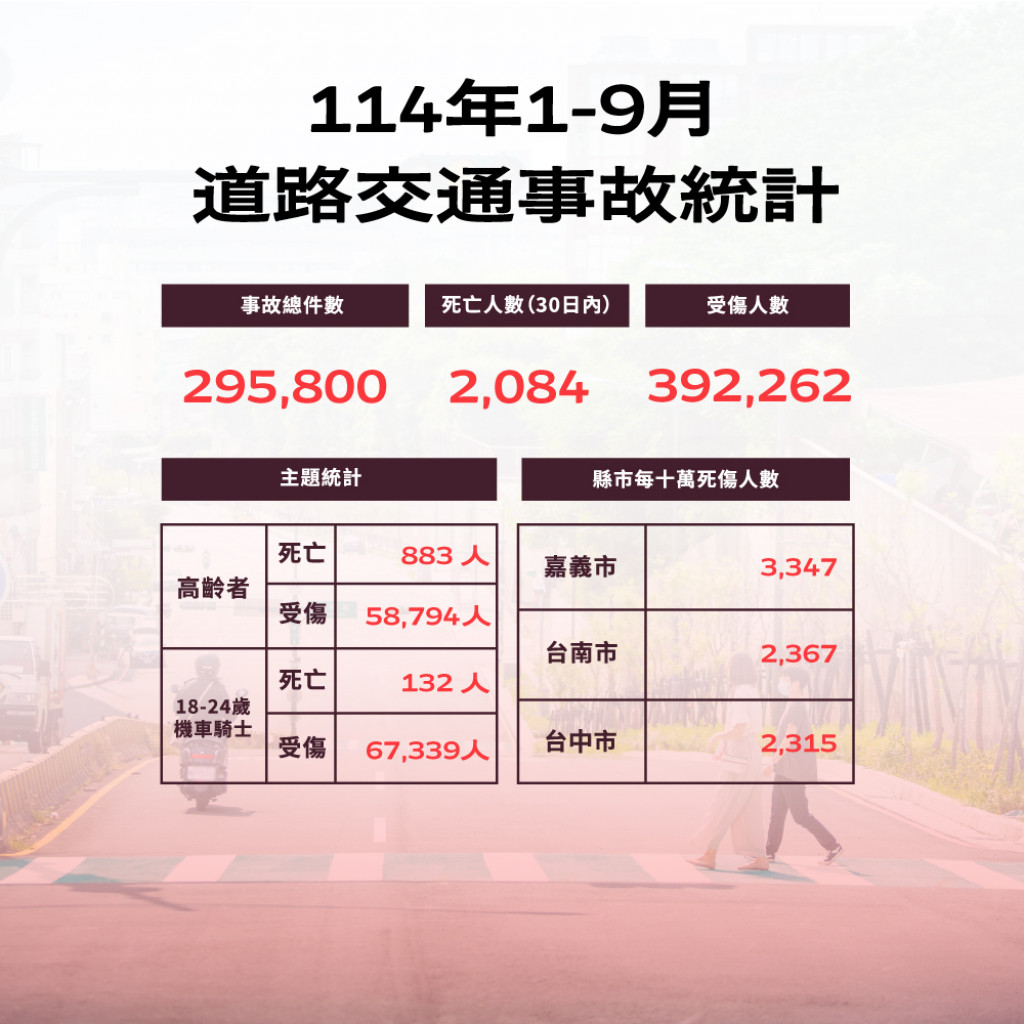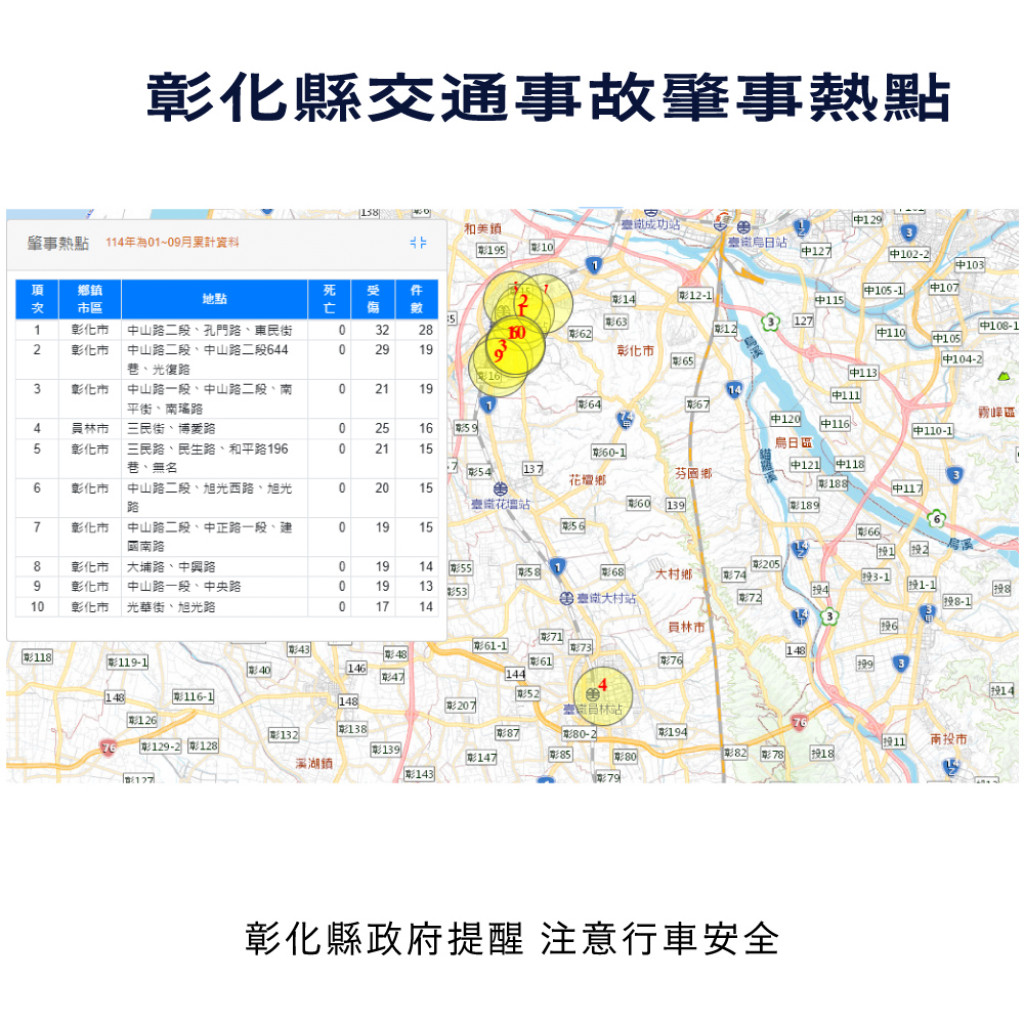 | 二、 | 根據交通部道安資訊查詢網,彰化縣114年1-9月道路交通事故與112年同期比較分析,以少年自行車騎士(含電自、電輔) 事故增加45%最高,外籍人士事故增加34.3%次之,自小客車駕駛人增加26%再次之。1-9月份鄉鎮市30日死亡人數於「彰化市、員林市、二林鎮」為多,肇事熱點以「彰化市」為多。 |